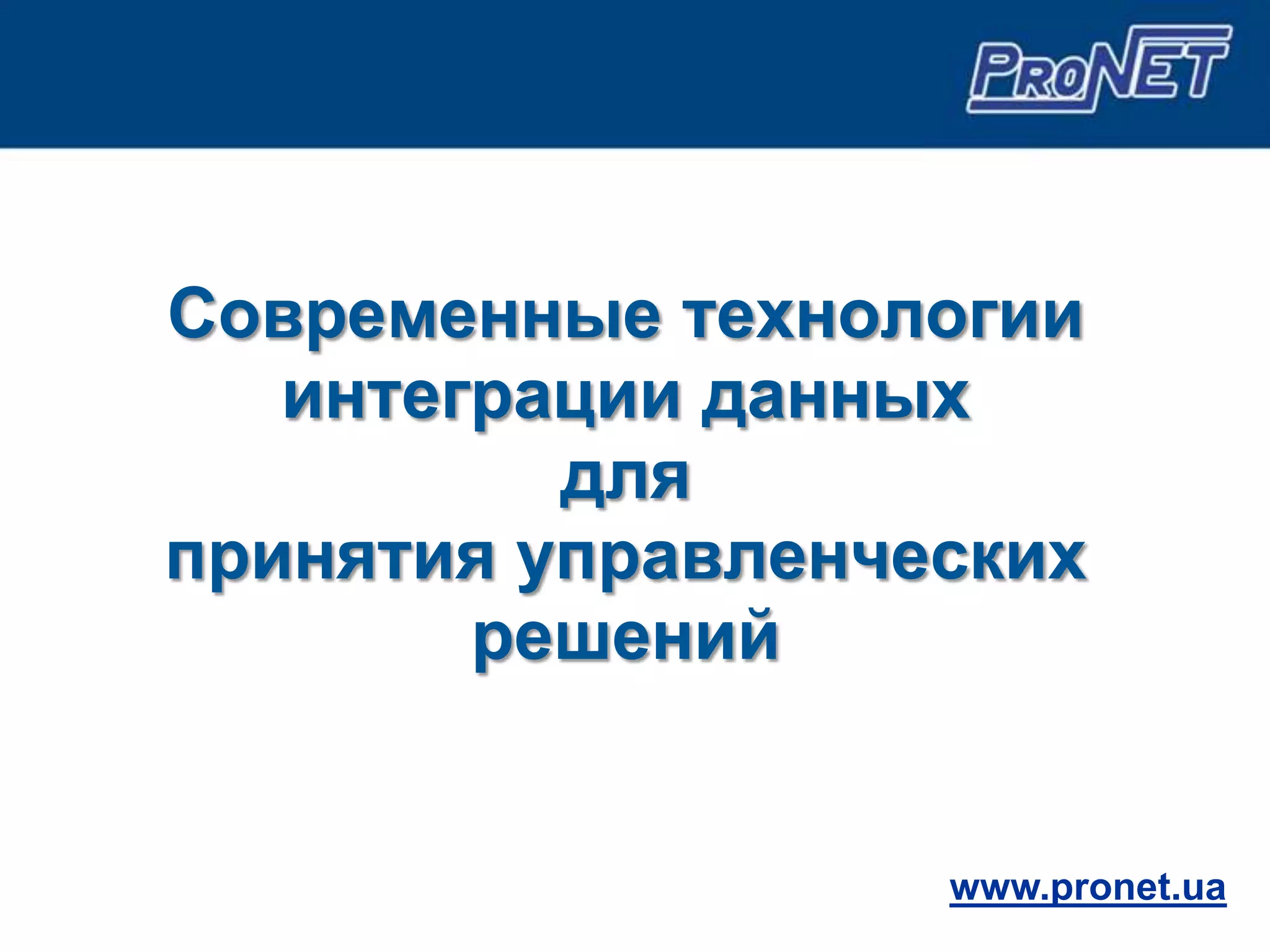 Документ описывает современные технологии интеграции данных и бизнес-аналитику, акцентируя внимание на роли фирмы Pronet в IT-секторе Украины. Подчеркивается значимость эффективного управления данными для оптимизации бизнес-процессов и предотвращения убытков, связанных с недостаточной аналитической информацией. Также рассматриваются решения Informatica и их преимущества в области управления качеством данных и построения хранилищ данных.