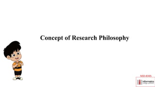 This document provides an overview of key concepts related to research philosophy. It discusses epistemology, ontology, axiology, and methodology. Epistemology is concerned with the nature and scope of knowledge. Ontology addresses basic assumptions about the nature of reality. Axiology studies the nature of value or worth. Methodology refers to the principles and procedures used in a field of study. The document also provides definitions and explanations of these philosophical concepts and how they relate to conducting research.