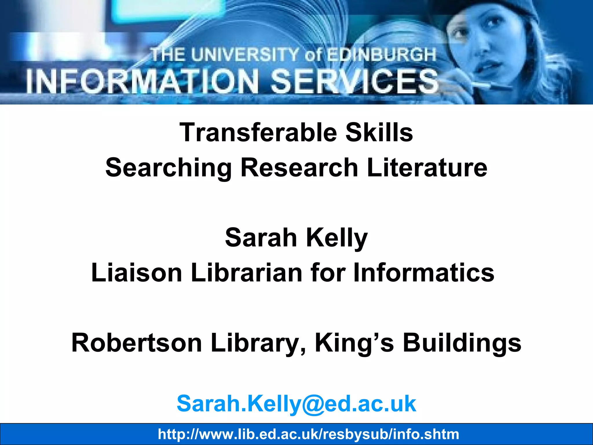 The document provides information about searching research literature and databases. It discusses recognizing information needs, locating relevant information through literature databases, evaluating search results, and using information effectively. It also outlines specific databases, search strategies, and resources for managing references.