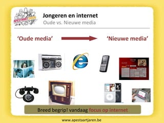 Jongeren en internetThey are online www.apestaartjaren.be Jongeren ongeveer 2 uur per dag online (OIVO) Internet wordt multifunctioneel gebruikt Top 5 MSN: sociale en communicatieve functie Informatie opzoeken: informatieve functie, voor school YouTube: ontspanningsfunctie Mail: sociale en communicatieve functie Games: ontspanningsfunctie