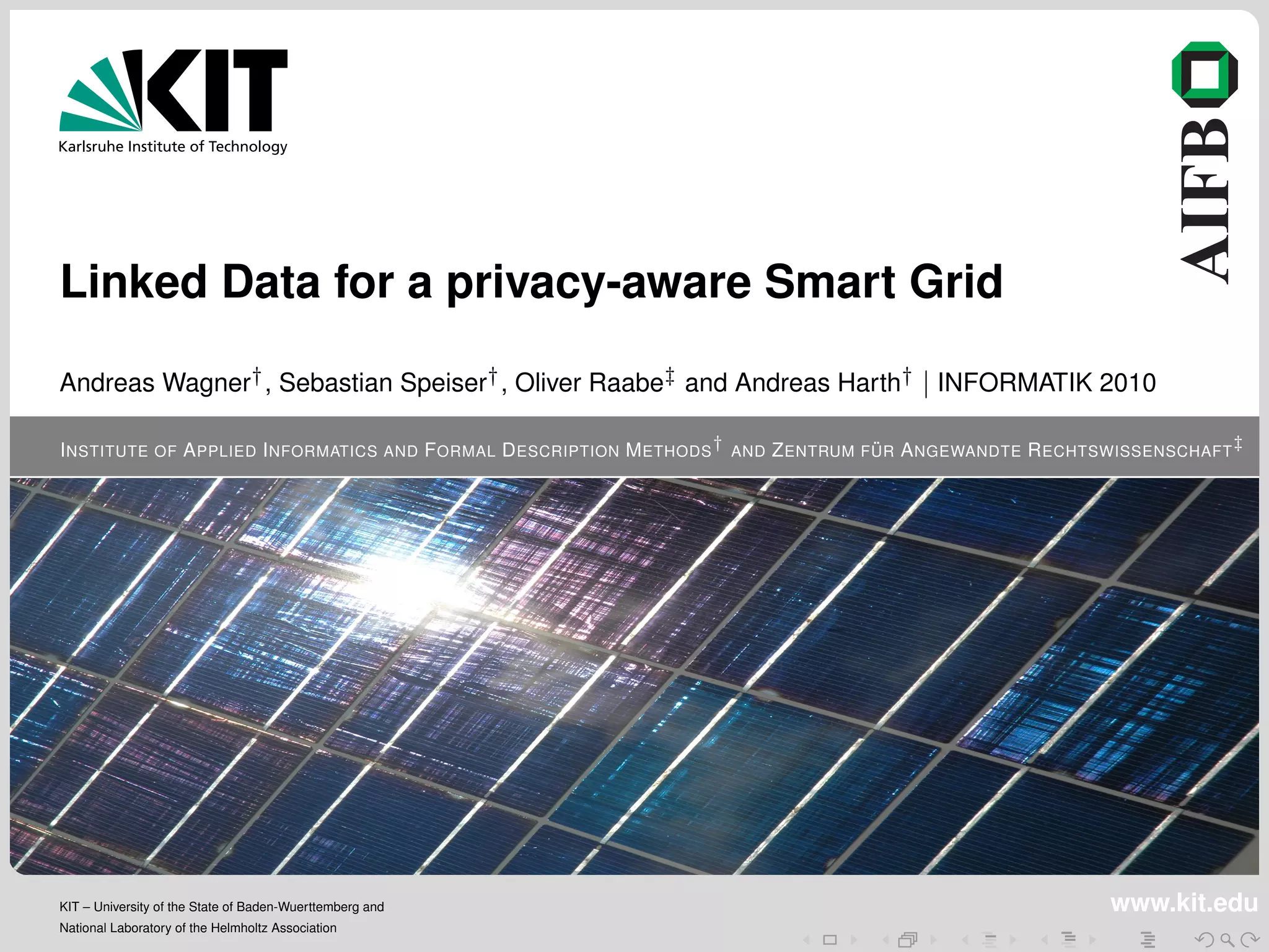 This document proposes a privacy-aware communication architecture and data model for the smart grid using semantic web technologies. It presents a policy model for expressing privacy restrictions on smart grid data through policies that are coupled to the published data. The policy model allows various actors to specify policies defining who can access what data for which purposes. A policy-aware data access procedure matches data requests to applicable policies. The approach is evaluated based on privacy principles such as data economy, purpose limitation and transparency. Future work is outlined to further develop technical enforcement of privacy in the smart grid.