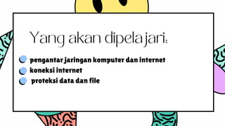 Dokumen ini membahas pengantar jaringan komputer dan internet, menyoroti bagaimana internet adalah penemuan yang mengubah komunikasi global. Jaringan komputer memungkinkan komputer untuk berbagi sumber daya dan beroperasi melalui berbagai tipe jaringan seperti LAN, WAN, dan MAN. Selain itu, pentingnya proteksi data dan file dijelaskan, mengingat risiko pencurian data yang semakin meningkat.