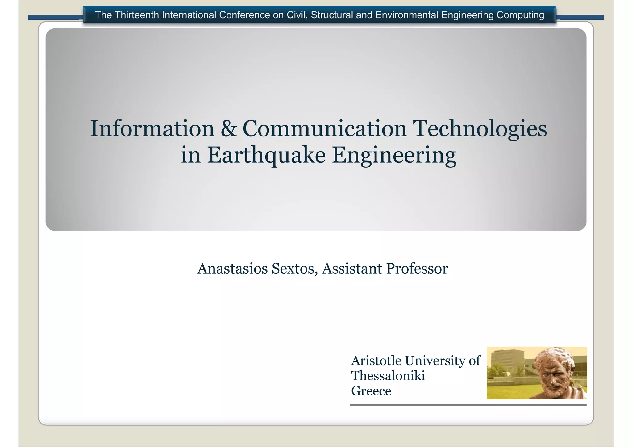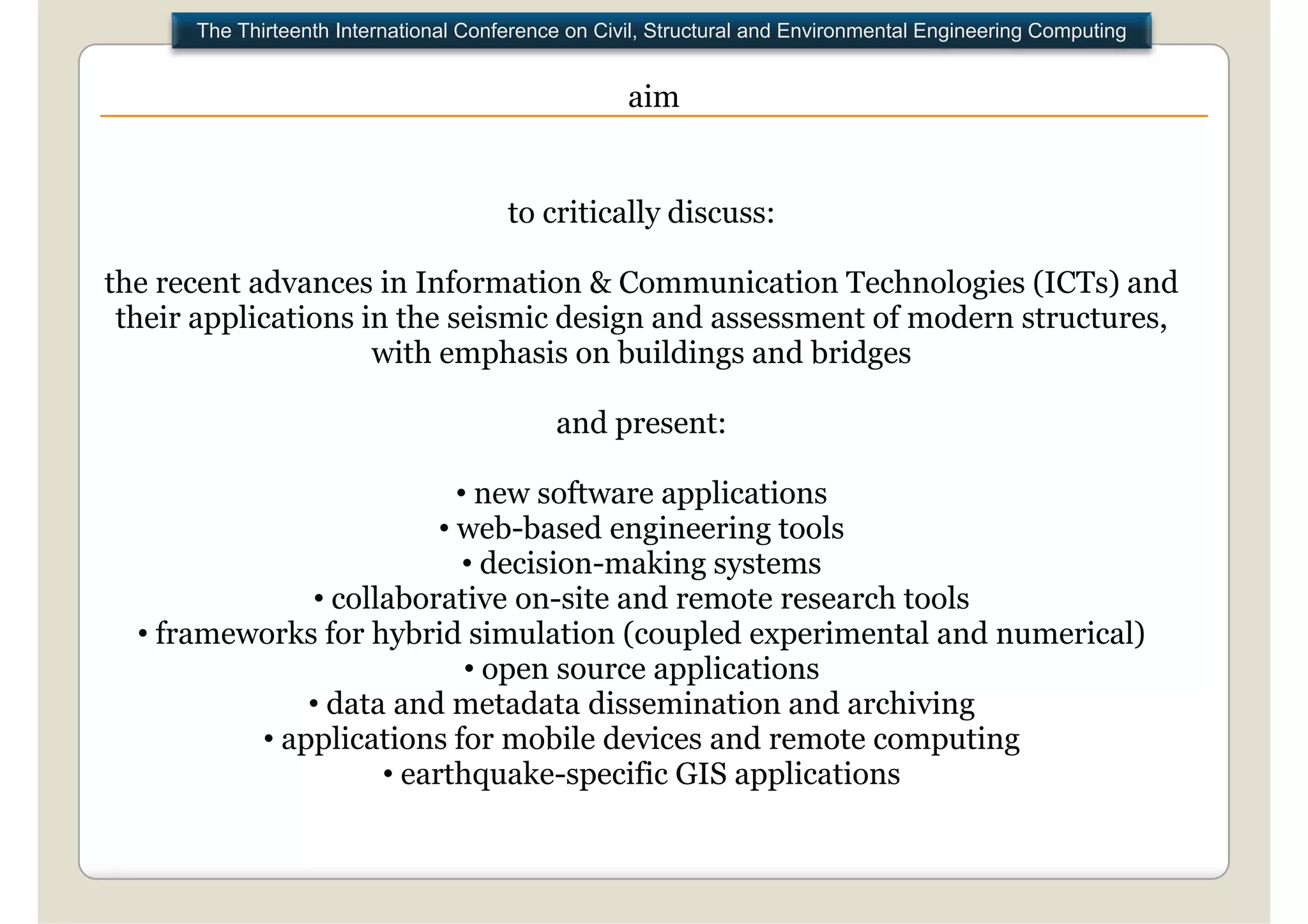 The Thirteenth International Conference on Civil, Structural and Environmental Engineering Computing focuses on advancements in information and communication technologies (ICTs) for the seismic design and assessment of structures, particularly buildings and bridges. Key topics include new software applications, decision-making systems, and modeling techniques to mitigate seismic risks and enhance structural reliability. The conference also explores the integration of sensor-based data acquisition and structural health monitoring systems to improve earthquake preparedness and response.