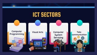 The document explores various sectors within Information and Communication Technology (ICT) and associated career opportunities, including programming, web and game development, graphic design, computer servicing, and telecommunication. It highlights trends such as superapps, the metaverse, AI integration in healthcare, cybersecurity, and blockchain technology, while also addressing challenges such as cybersecurity threats and the digital divide. The content aims to provide insights for future career paths and to encourage discussion on emerging trends in ICT.