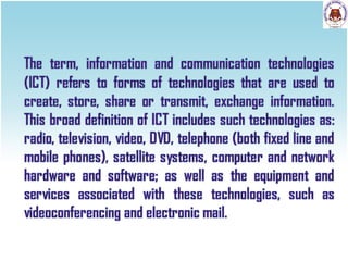 This document discusses information, communication, technology, ICT, and their roles in education. It provides information on: