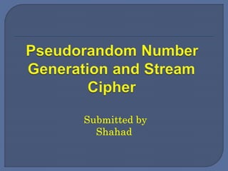The document discusses various types of random number generation, focusing on the importance of randomness and unpredictability for network security, specifically in encryption applications. It differentiates between pseudorandom and true random numbers, explains their generation processes, and outlines criteria for validating randomness. Additionally, it details cryptographic algorithms and stream ciphers, particularly RC4, emphasizing secure key management and implementation considerations.