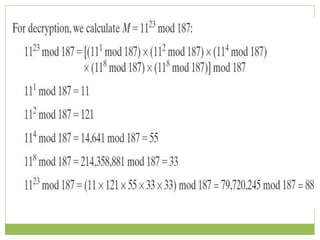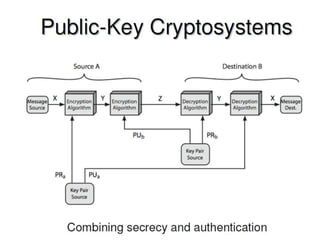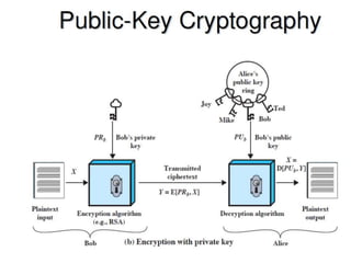 The document outlines the principles of public-key cryptography, focusing on the RSA algorithm as the most widely used public-key cryptosystem. It explains how asymmetric encryption uses a pair of keys, a public key for encryption and a private key for decryption, and describes key generation, digital signatures, and key exchange processes. The RSA algorithm's security relies on the difficulty of factoring large composite numbers, and it includes multiple approaches for potential attacks.