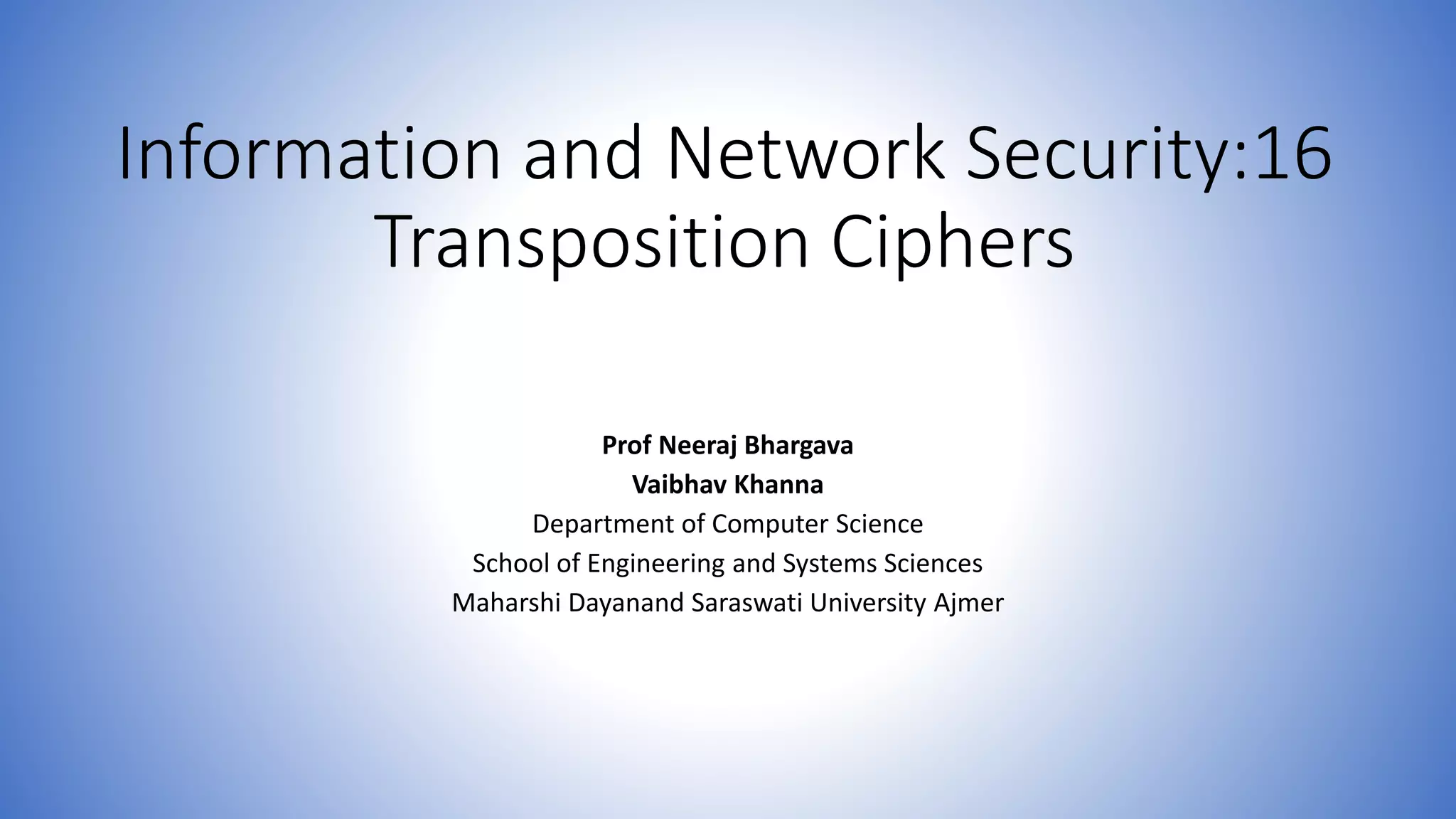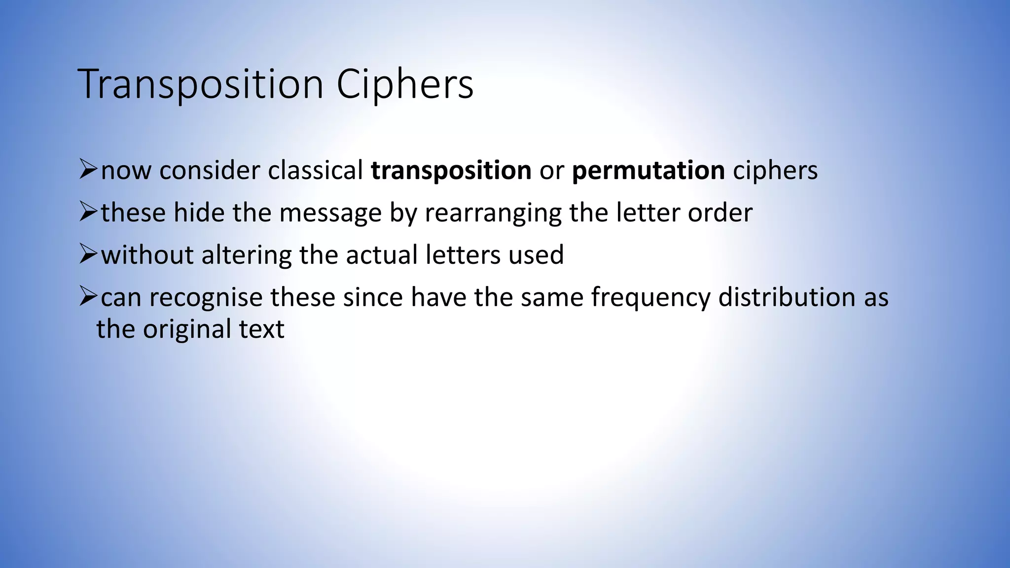 The document discusses transposition ciphers, which hide messages by rearranging the order of plaintext letters without changing their actual values. It explores various transposition techniques, including the rail fence cipher and columnar transposition, explaining how these methods maintain the original letter frequencies, making them identifiable. Furthermore, it contrasts classical ciphers with modern ciphers, highlighting the introduction of rotor machines during WW2, which employed complex substitution through rotating mechanisms to enhance security.