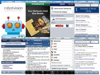 This document provides an overview of mobile technology and its applications in healthcare and libraries. It discusses the growing use of mobile phones worldwide and the rise of mHealth applications that support health monitoring, education and communication. It also outlines different mobile platforms like iOS, Android and Blackberry and considerations for developing mobile websites or native apps. QR codes and augmented reality are presented as technologies that can enhance access to information on mobile devices.