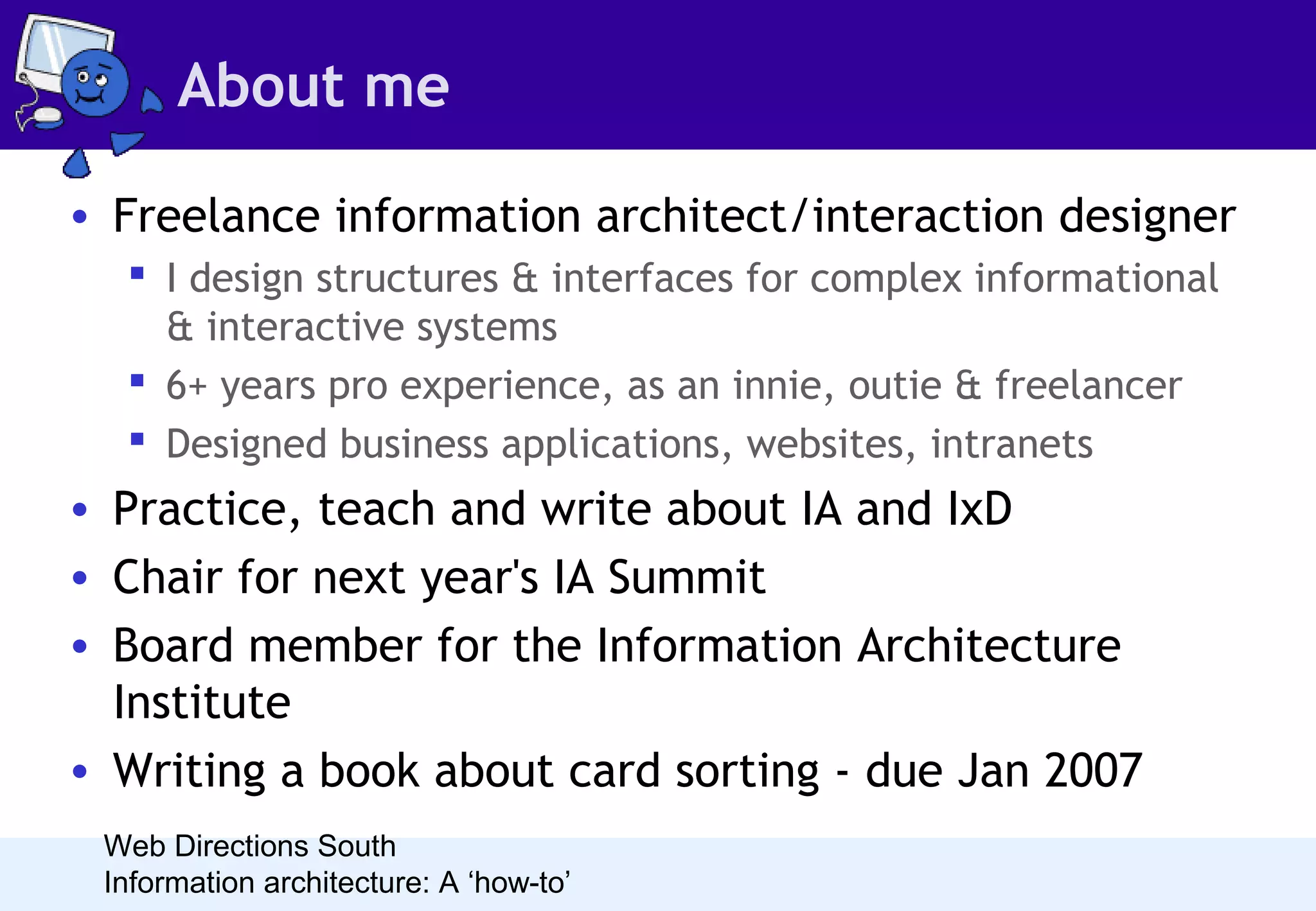 This document provides an overview of Donna Maurer's presentation on information architecture. She discusses conducting user research through methods like interviews, card sorting, and surveys. Key insights from research are analyzed using affinity diagramming and dimensional analysis. Different types of information structures are explored, including hierarchies, databases, faceted classification, and organic structures. Classification schemes like topic, task, audience, and geography are also examined. The goal is to organize content in a way that allows people to discover the information they need.