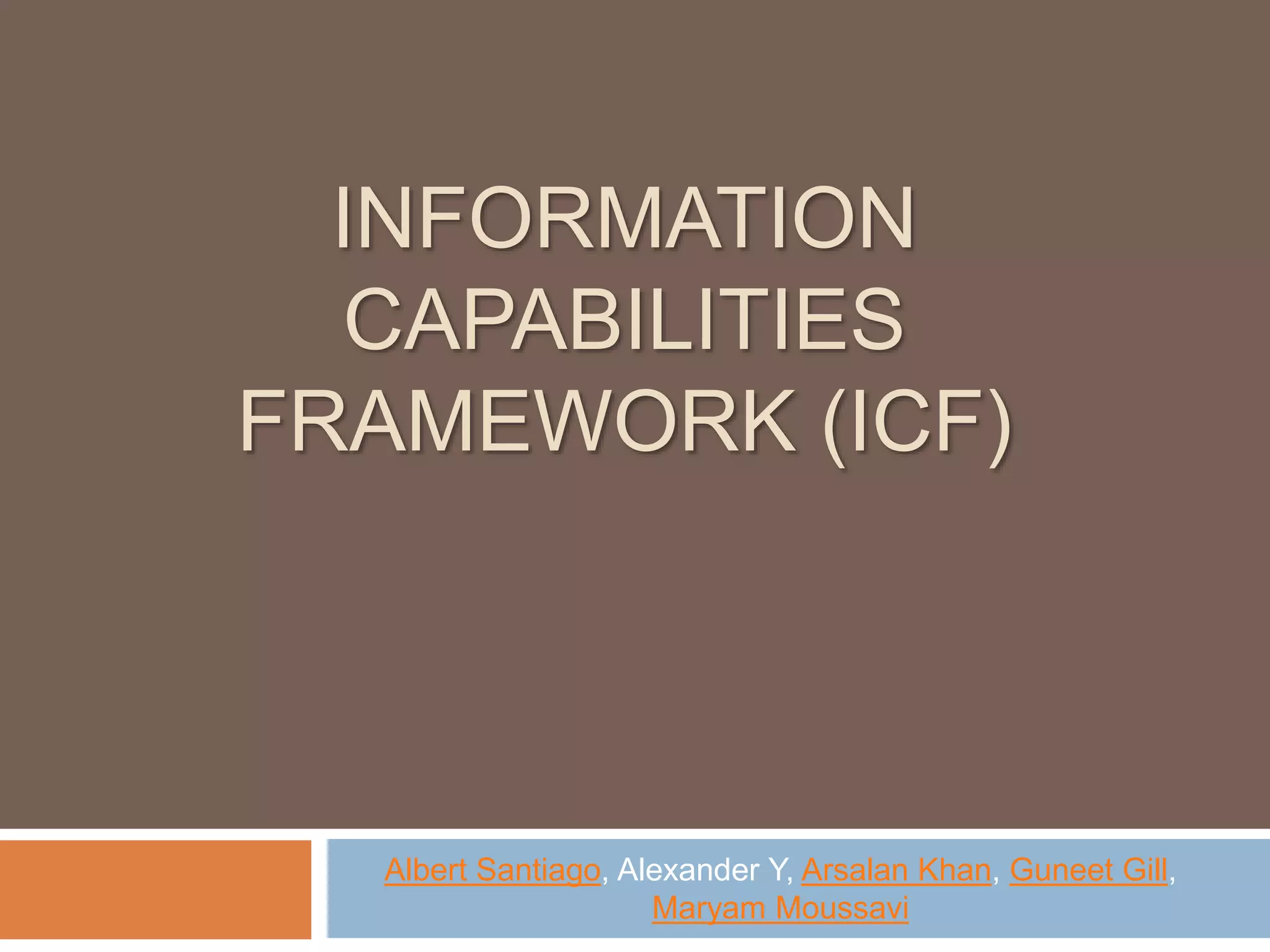 The Information Capabilities Framework (ICF) is a strategic tool designed to help organizations maximize the value of their information assets through improved data management and integration. It emphasizes a capability-driven approach over technology silos and aims to enhance decision-making, agility, and compliance. The framework is intended to support organizations in evolving their information infrastructure over a period of 5-10 years for greater flexibility and effectiveness.