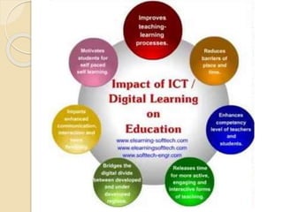 ICT refers to any communication technology including devices like radio, television, mobile phones and computers as well as network hardware, software, and satellite systems. ICT encompasses technologies used for telecommunication, broadcast media, audio/visual processing and transmission, and network-based control and monitoring. Some types of ICT used in education include teleconferencing through audio conferencing, video conferencing, and computer conferencing.