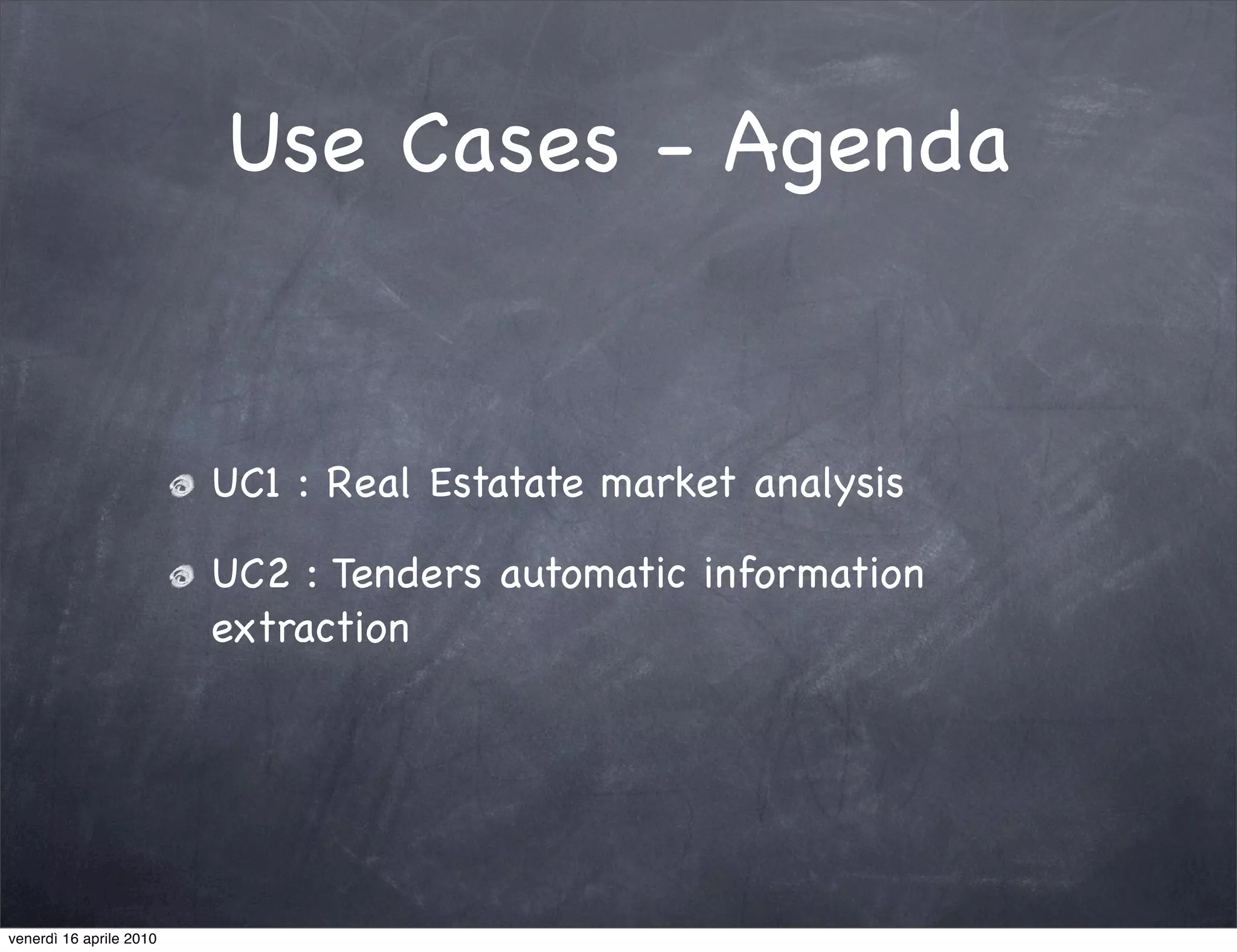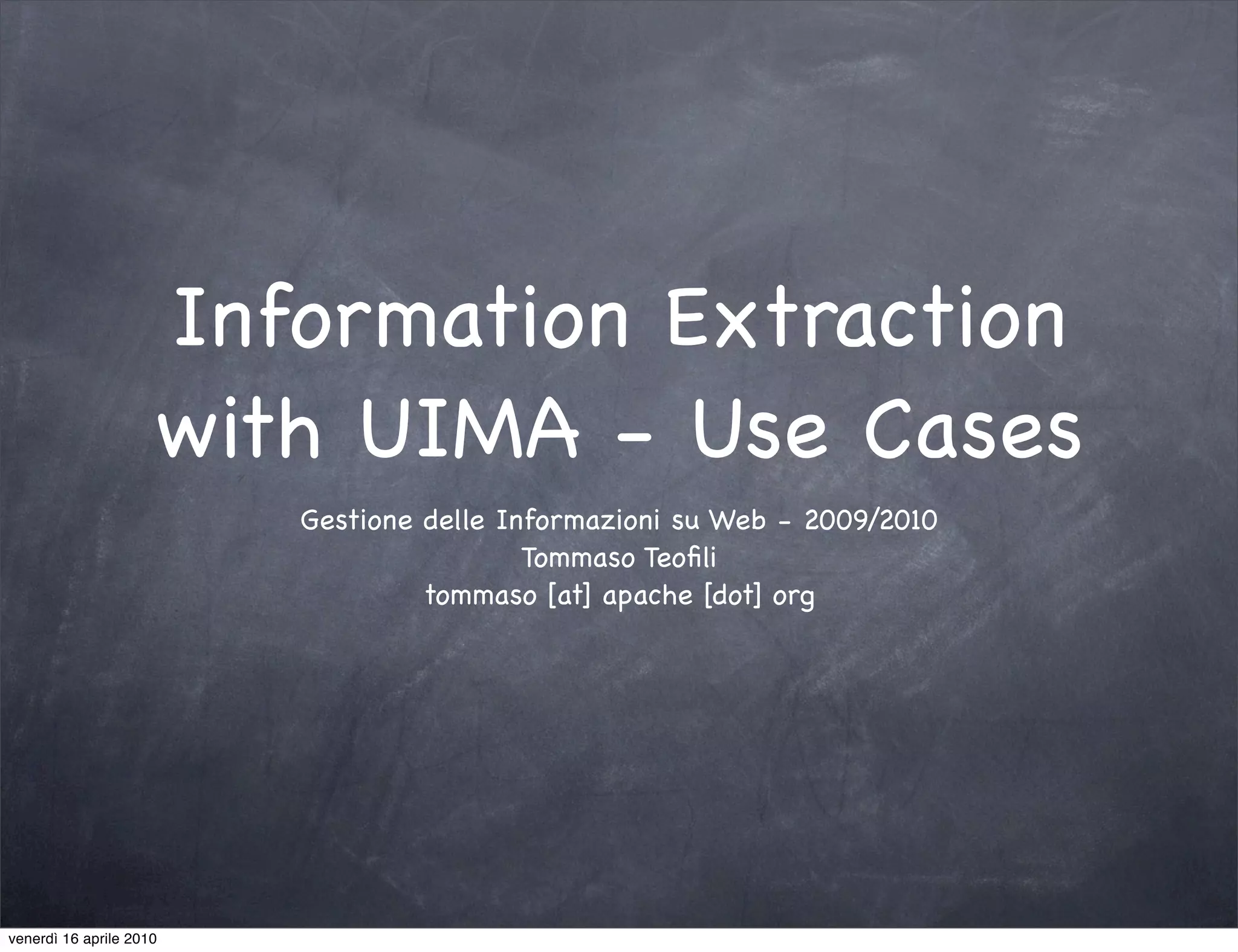The document discusses the use cases of information extraction with UIMA, focusing on real estate market analysis and automated monitoring of tenders. It outlines the goals of building an information extraction engine to process unstructured estate listings and automate the monitoring of relevant announcements. The approach involves using specialized crawlers, annotators, and a structured analysis pipeline to extract and manage data efficiently.