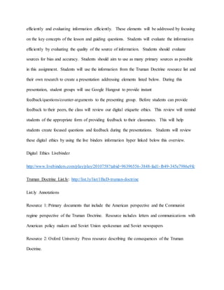 This document provides an overview for a multi-lesson unit on the Cold War for high school students. Lesson 1 focuses on the Truman Doctrine and has students research and present on its impact. Lesson 2 examines new communist regimes in Asia and has students write persuasive letters. Lesson 3 analyzes the role of geography in US containment policy and has students identify countries at risk of communist influence. Students use online resources and tools like Google Slides, Hangouts, and interactive maps for research, collaboration, and presenting their work.