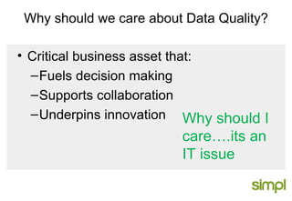 The document discusses the importance of data quality in healthcare and some of the challenges faced. It notes that poor data quality can lead to impaired decision making, increased safety risks, and lost funding. While data quality issues are not new, the full extent of problems across different healthcare organizations is largely unknown. The document recommends taking a holistic approach to improving data quality that involves all levels of an organization, including leadership support, staff training, clear processes, and system controls.