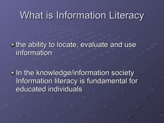 Information literacy is defined as the ability to locate, evaluate, and use information effectively in the modern knowledge society, evolving from basic tool-based skills to teaching competencies essential for lifelong learning. The shift from web 1.0 to web 2.0 has transformed information access and authority, emphasizing user-generated content and collaborative knowledge production. To adapt, educational institutions and librarians must integrate new literacies related to social networking and the evaluation of information authenticity into their programs.