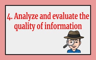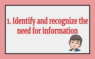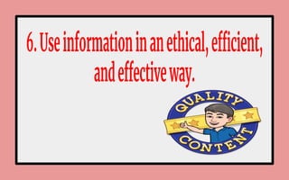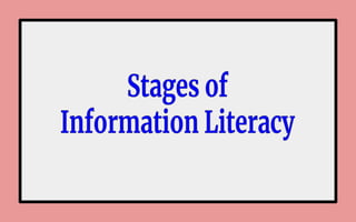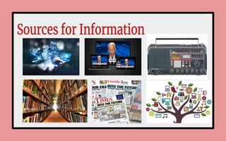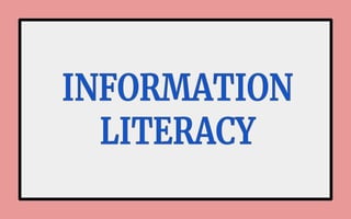 The document discusses information literacy and the importance of being able to effectively locate, evaluate, and use information. It notes that information comes from many sources, including libraries, organizations, and the internet, which can feel overwhelming. Being information literate involves recognizing when information is needed and having the skills to find, understand, and apply the most relevant information. Information literacy is a lifelong skill that supports learning, communication, and decision-making.