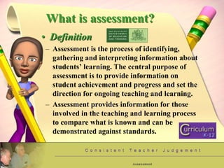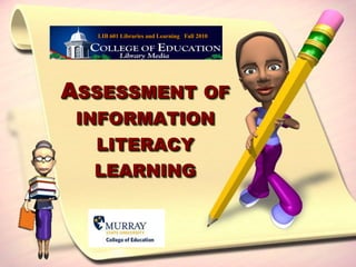 The document discusses assessment of information literacy learning. It defines assessment as identifying, gathering and interpreting information about student achievement and progress to guide teaching and learning. Assessment provides information to compare student knowledge against standards. It discusses different forms of assessment including observation, formal tasks, formative monitoring and summative assessment. Authentic assessment involves real-world tasks to demonstrate skills. The roles of library media centers in assessment development are explored, including developing resources and assessments with teachers.