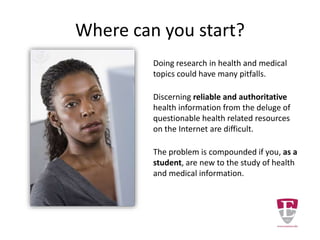 This document provides information and guidance for health sciences students on developing information literacy skills. It defines information literacy and health information literacy as the abilities needed to find, evaluate, and apply relevant information to make good health decisions. The document emphasizes that these skills are important for students' academic success and future professional work, when communicating health information and advising patients. It highlights authoritative library resources that can help students conduct reliable research.
