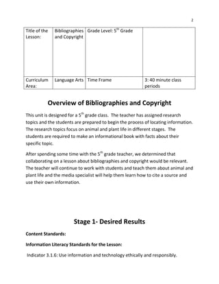 This document provides details of a 3-day lesson plan for a 5th grade class on bibliographies and copyright. The lesson introduces students to concepts like plagiarism, citing sources, and copyright through activities like role playing copyright scenarios, citing sources in books and online, and creating sample bibliographies. Students are assessed throughout by practicing citing different source types like novels, encyclopedias, magazines, and websites. The goal is for students to understand how to properly cite research sources for an informational book project on various science topics.