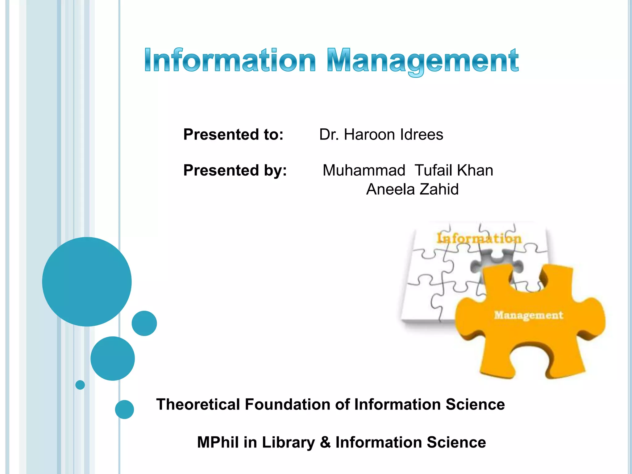 The document discusses the key concepts of information management. It begins by defining data and how it is transformed into information. It then discusses definitions of information and management, and how information management originated from fields like archives, records management, and librarianship. It also notes the influence of information technology. The document outlines the importance of information management and its goals, strategies, elements, lifecycle, resources, and tools. It discusses access, privacy, security and relevant laws. Finally, it concludes with questions for further discussion.