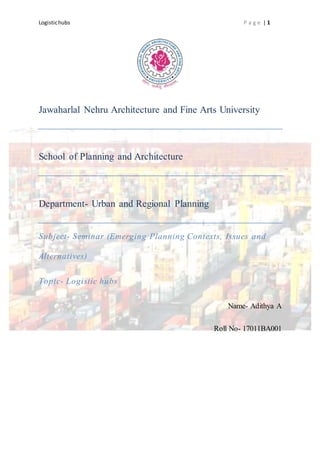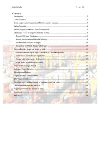This document discusses logistics hubs in India. It outlines the challenges facing India's logistics industry, including inefficient transportation infrastructure, poor storage facilities, a complex tax structure, and skills and technology gaps. Specifically, it notes road networks are congested, rail freight is expensive and slow, ports have long turnaround times, and warehousing is generally outdated. It also examines current issues like outsourcing to smaller operators and safety concerns. However, it predicts future growth in the logistics sector driven by initiatives to improve infrastructure like dedicated rail corridors between major cities. Overall the document provides an overview of India's logistics industry, challenges, and plans for future development.
