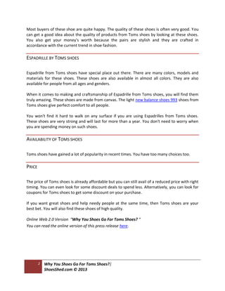 Toms shoes were founded in 2006 when an American visitor to Argentina saw children without shoes. The company donates a pair of shoes to a needy child for every pair purchased. Toms shoes are of good quality and stylish, coming in many colors and designs. They are comfortable and durable, especially the popular espadrille style. Toms shoes have grown popular globally and are affordable, with discounts sometimes available through coupons or sales. Purchasing Toms shoes provides both fashionable footwear and charity support to children in need.