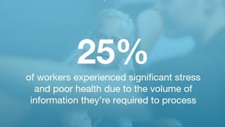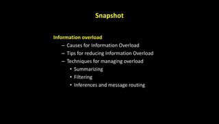 This document discusses information overload and techniques for managing it. It defines information overload as having too much information that makes understanding issues and decision-making difficult. Common causes include an increasing rate of new information and multiple sources. The document recommends summarizing, filtering, and routing only relevant messages to reduce overload. It also provides specific techniques for each, such as reducing data to concise, meaningful summaries and drawing inferences from large datasets.