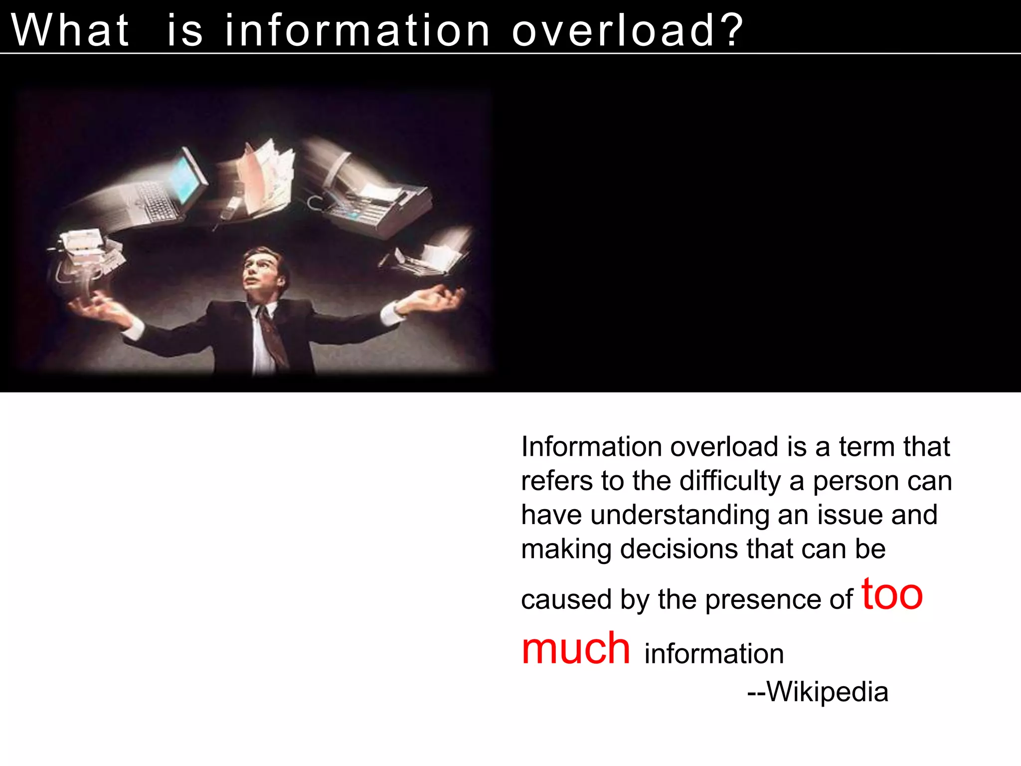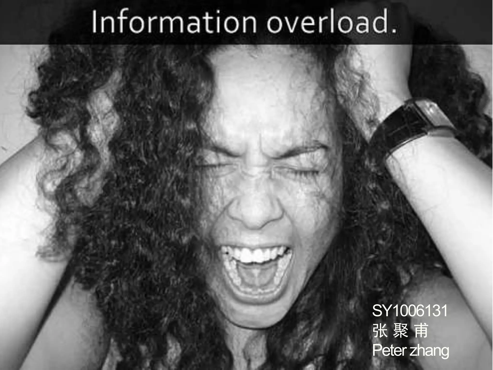 Information overload occurs when there is too much information for a person to process, understand an issue, and make effective decisions. It is caused by new information being produced rapidly, data being easily duplicated and transmitted through multiple channels, and information lacking structure and containing inconsistencies. When faced with information overload, people can experience nervous breakdowns, diminished work efficiency, information fatigue, hesitation to make decisions, and stress-related diseases. To cope, one should organize information, control and reduce incoming channels, and accept they cannot process everything while focusing on the most important tasks.