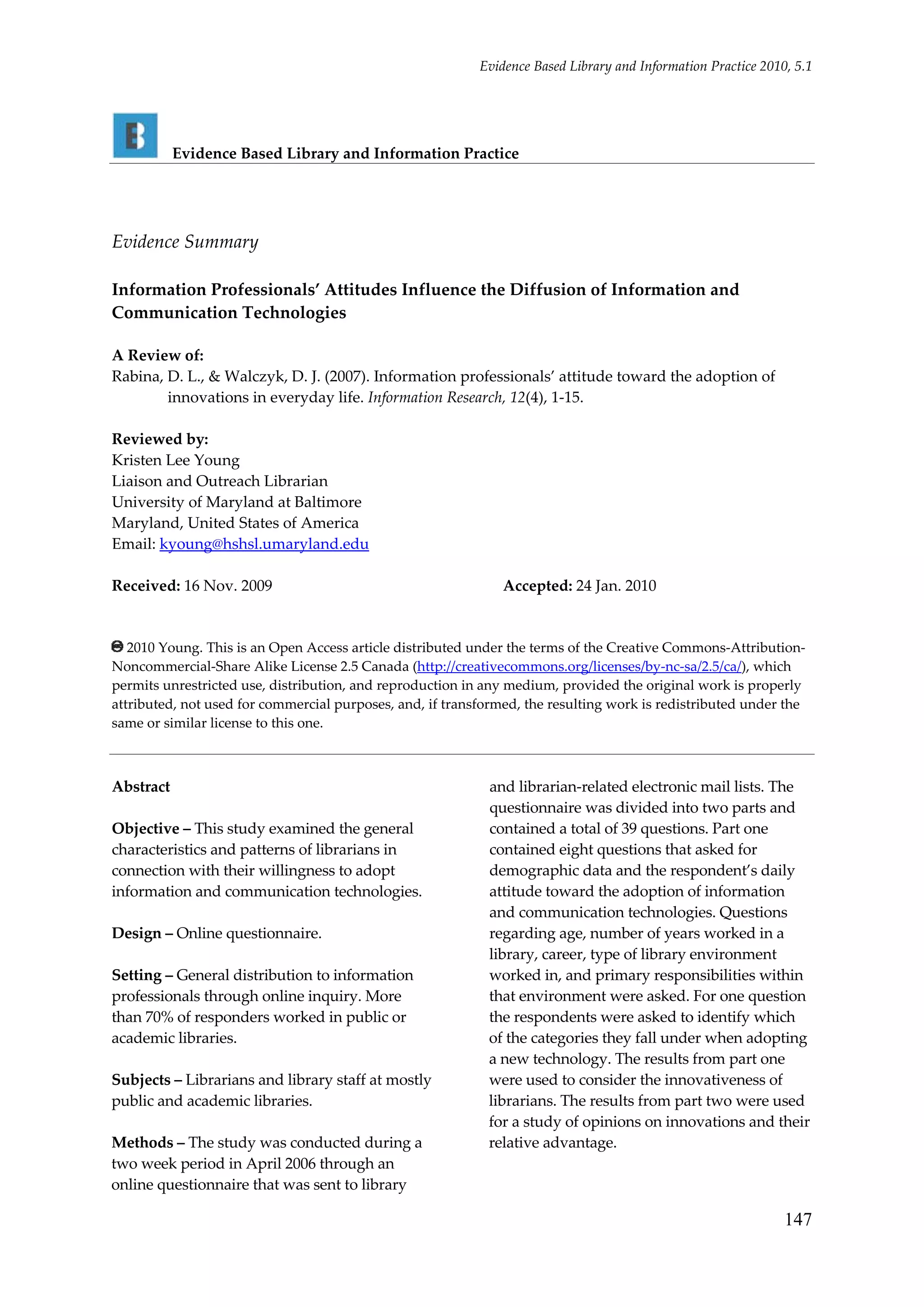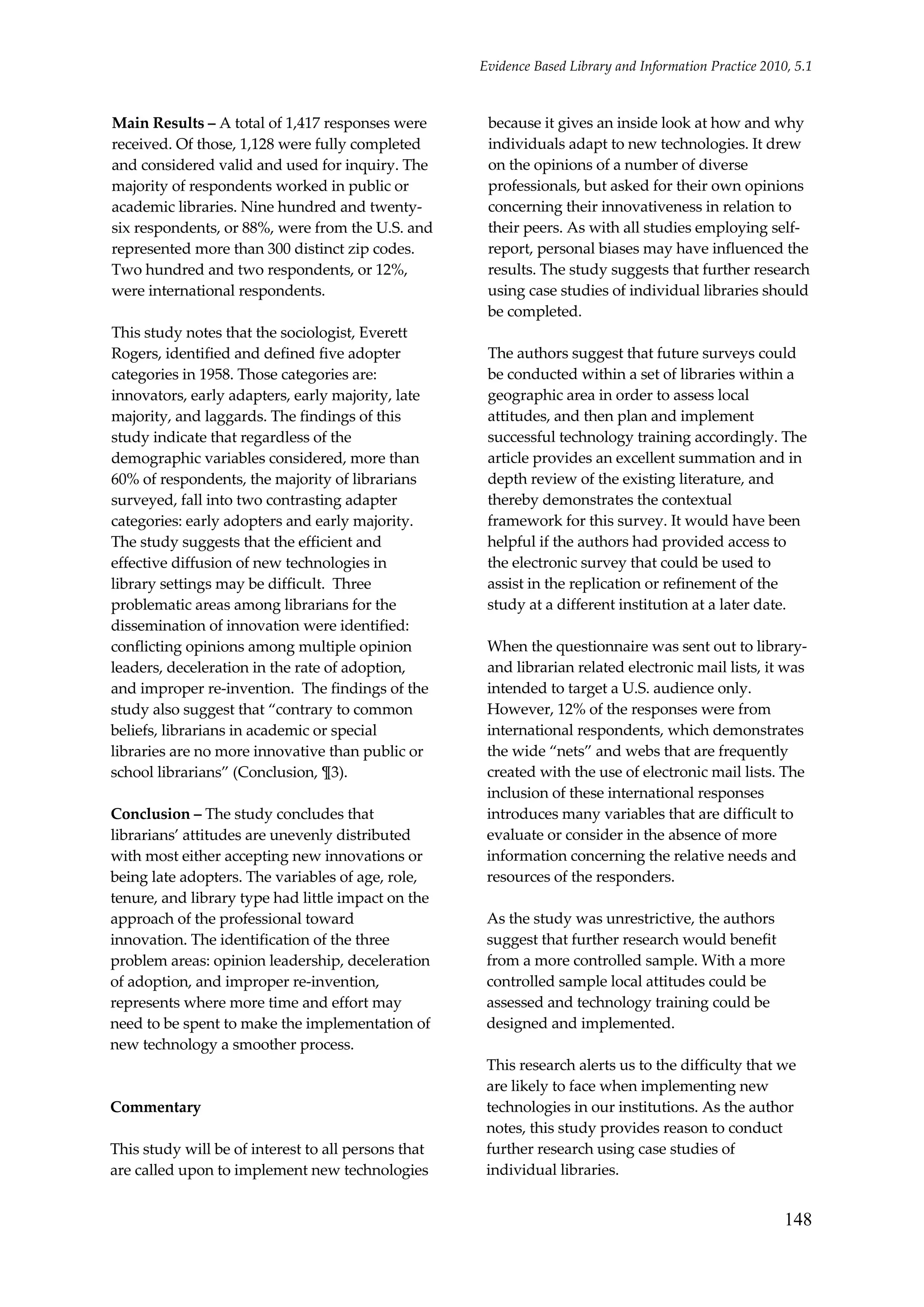 The study examines librarians' attitudes toward adopting information and communication technologies, revealing that over 60% of respondents identified as early adopters or early majority. Despite being unrestrictive, the findings indicate uneven distribution of attitudes, with common challenges such as conflicting opinions and deceleration in adoption rates. The research suggests the need for further studies using controlled samples to better assess local attitudes and enhance technology training implementation.