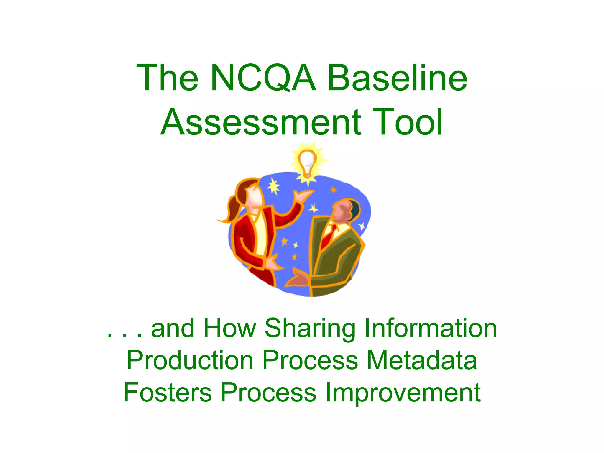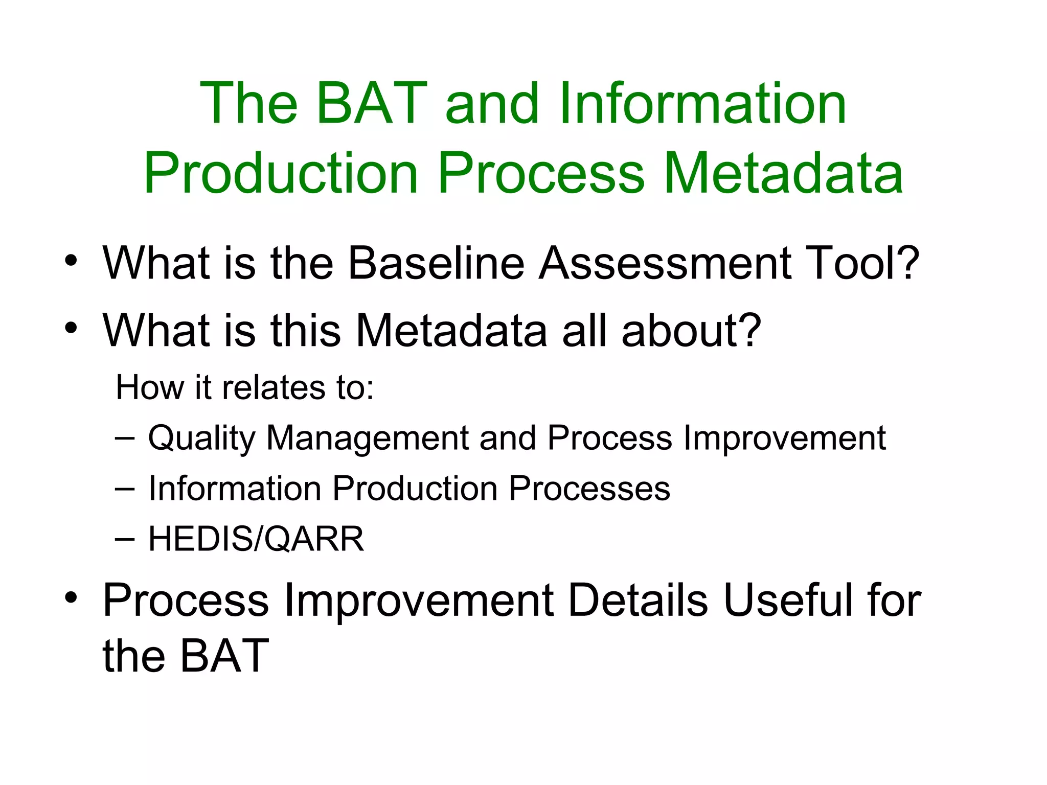 The NCQA Baseline Assessment Tool (BAT) aids in ensuring the reliability of health plan information systems for quality measure generation and compliance audits associated with HEDIS/QARR. The document details how information production process metadata establishes a common understanding among stakeholders, fostering process improvement, quality management, and accountability in information stewardship. It emphasizes the significance of measuring data quality in terms of timeliness, completeness, and accuracy while implementing continuous improvements in information production and reporting processes.