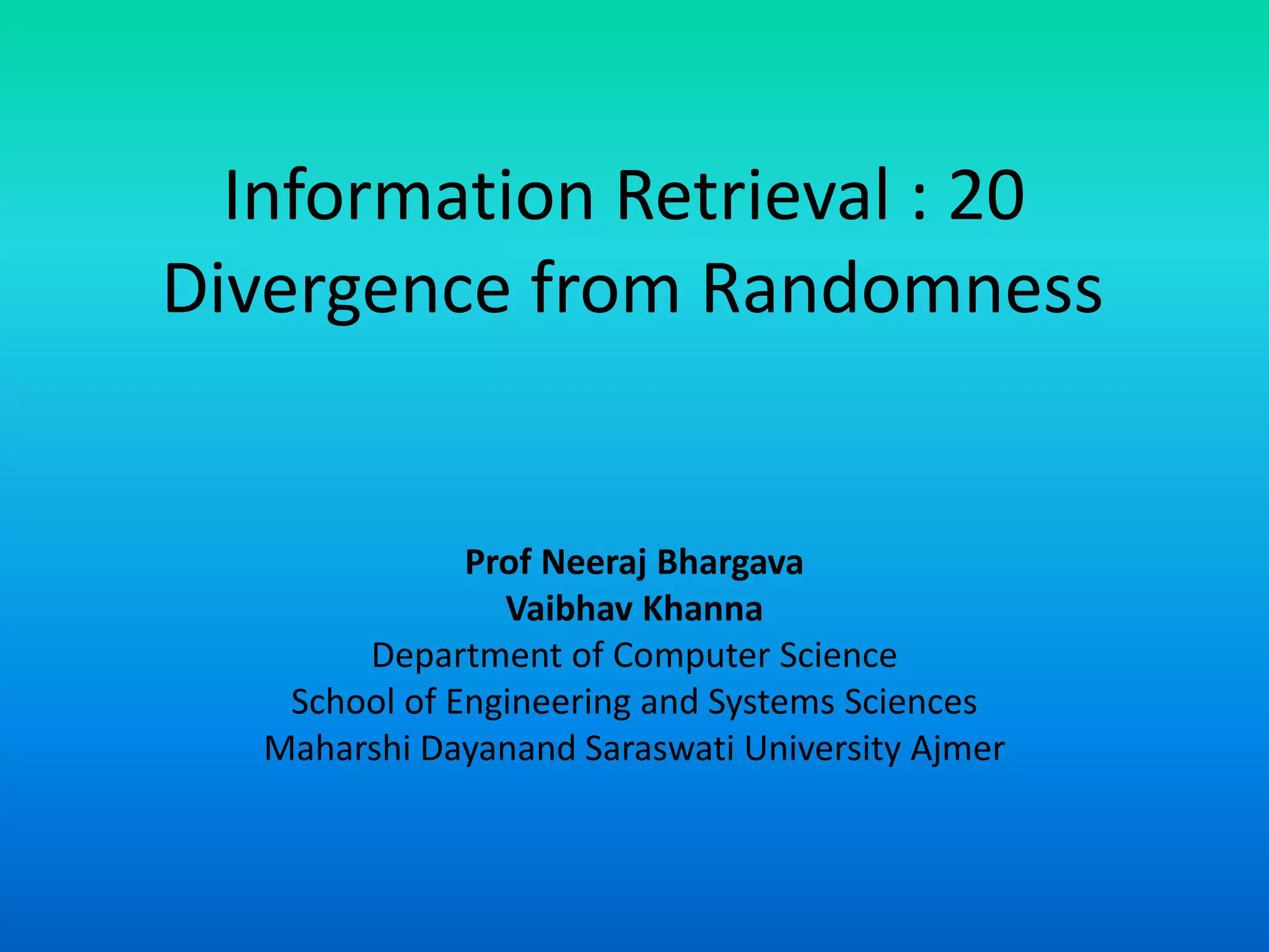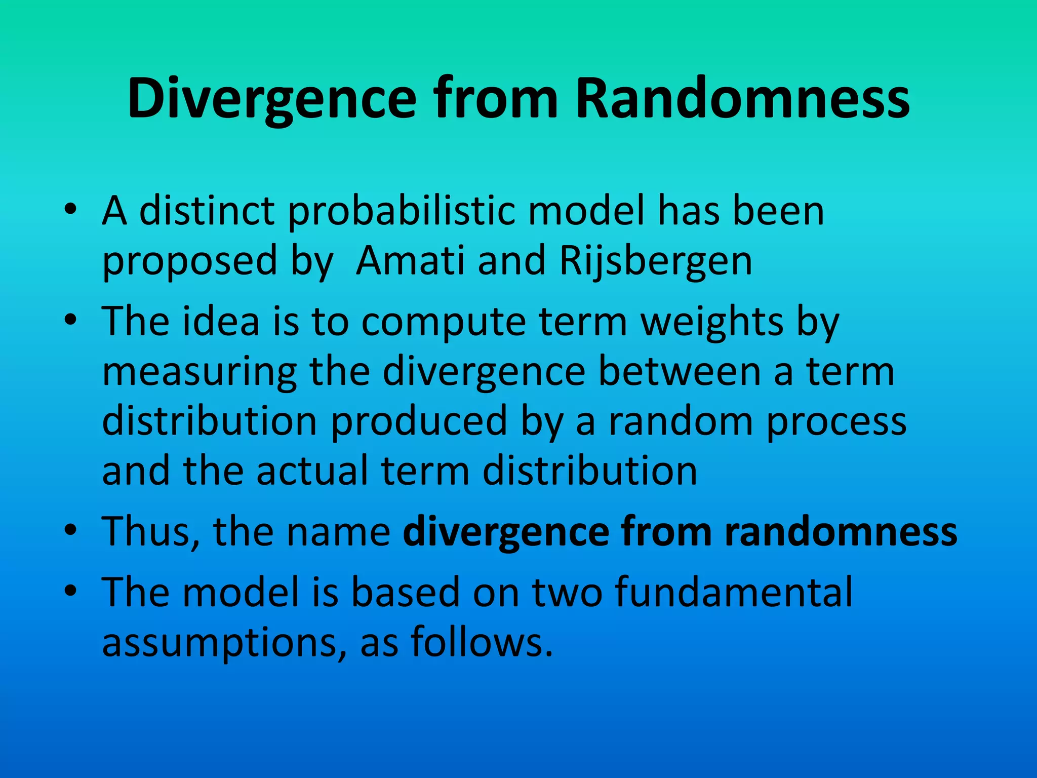 The document discusses a probabilistic model for information retrieval called 'divergence from randomness,' proposed by Amati and Rijsbergen, which computes term weights based on the difference between random and actual term distributions. It is built on two assumptions: that not all words carry equal importance and that a more refined term distribution can be obtained from a specific subset of documents containing the term. The model employs various probability distributions, including binomial and Poisson processes, to assess the significance of terms within the context of information retrieval.