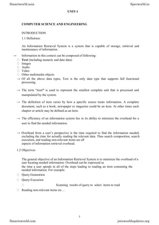 This document provides an overview of an information retrieval system. It defines an information retrieval system as a system capable of storing, retrieving, and maintaining information such as text, images, audio, and video. The objectives of an information retrieval system are to minimize the overhead for a user to locate needed information. The document discusses functions like search, browse, indexing, cataloging, and various capabilities to facilitate querying and retrieving relevant information from the system.
