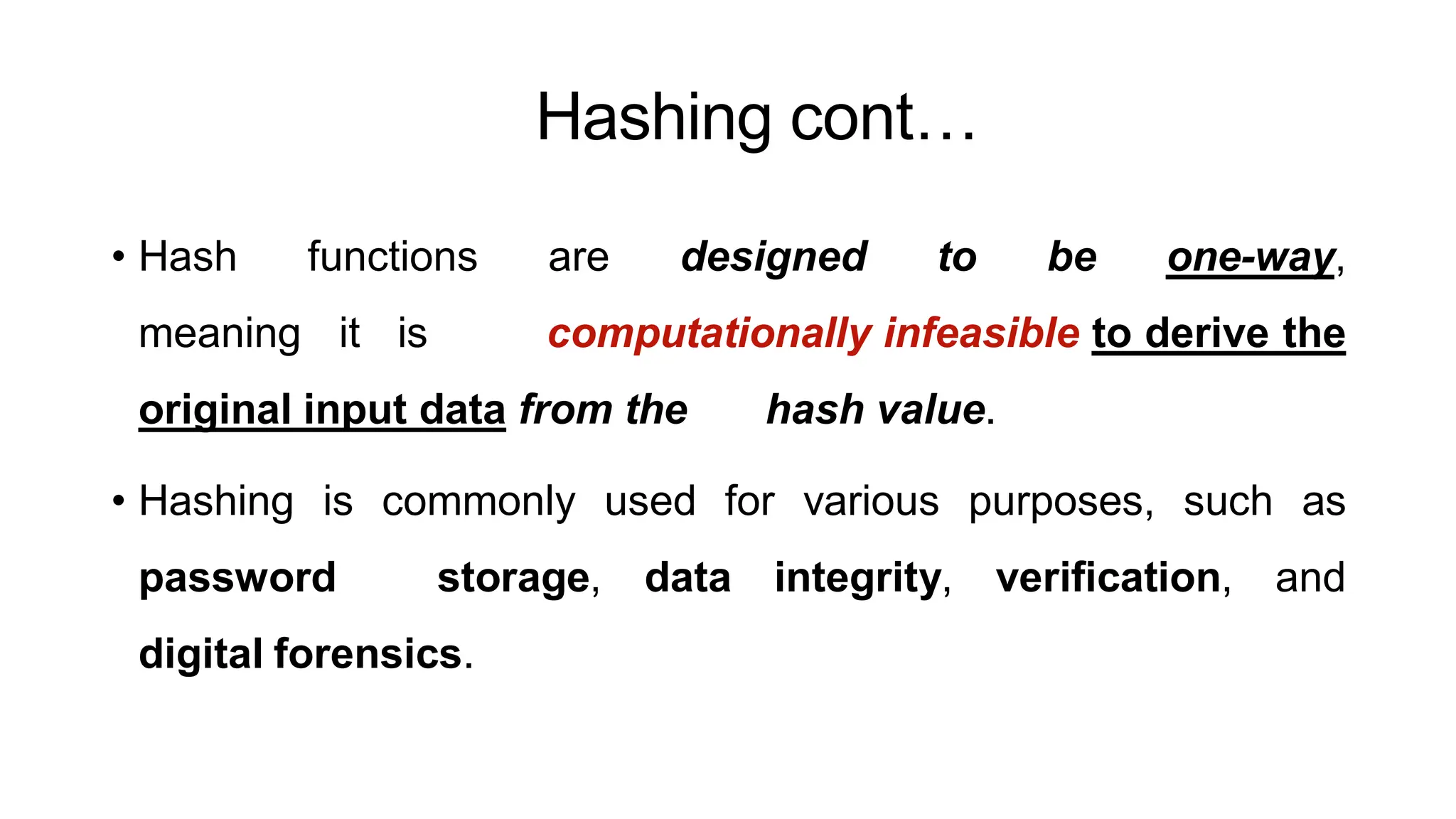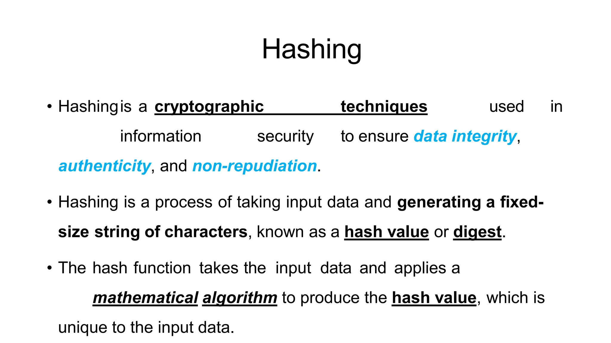 Hashing is a cryptographic technique essential for data integrity, authenticity, and non-repudiation, generating unique fixed-size hash values from input data. It is widely used in applications like password storage and digital signatures, with well-known algorithms including SHA-256 and Argon2. Digital signatures use hashing to ensure sender authenticity and document integrity, relying on public key infrastructure for verification.