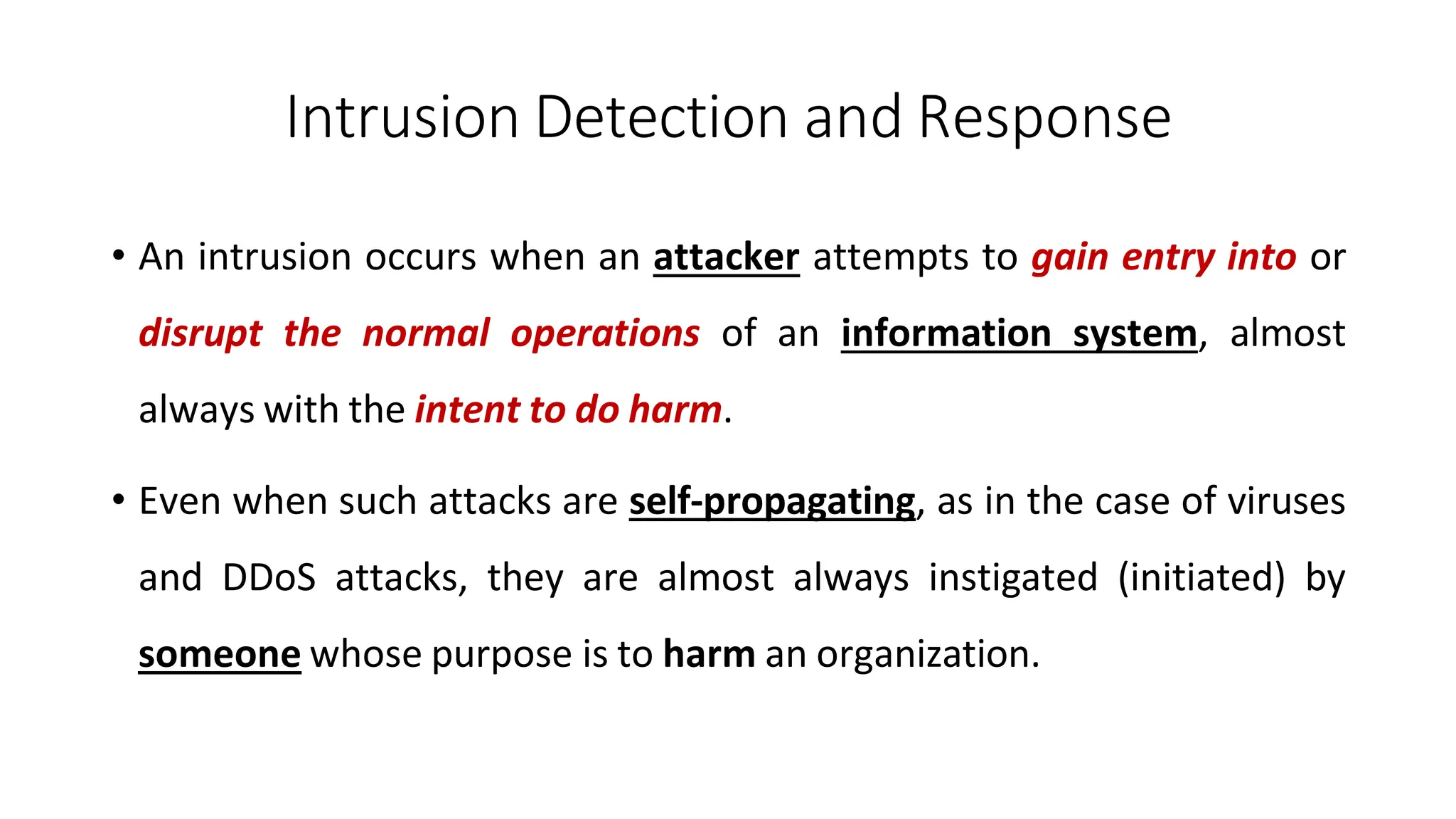 The document outlines the concepts of intrusion detection and response (IDR) in cybersecurity, detailing the processes involved in monitoring, detecting, and responding to unauthorized activities within a network. It emphasizes the importance of implementing security policies, using technology-based countermeasures, and conducting thorough investigations and documentation for effective incident response. The goal of IDR is to minimize damage from security incidents and enhance an organization's security posture.
