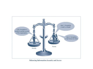 Information security involves protecting information and systems from unauthorized access, use, disclosure, disruption, modification, inspection, recording or destruction. It is necessary to balance security controls with reasonable access. Key elements of information security include confidentiality, integrity, availability, and utility. Organizations implement administrative, logical and physical controls and follow a risk management process to identify vulnerabilities and select appropriate security measures. Laws and regulations also govern data security.