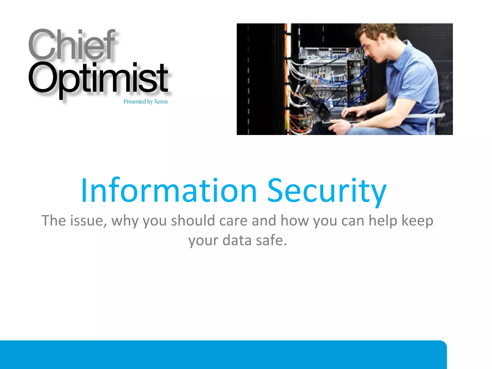 This document discusses the importance of data security and provides information about common security threats. It notes that there were over 800 data breaches in 2011 compromising 174 million records, with the majority of attacks being external and involving digital hacking. Common motives for attacks are fraud, activism, and industrial espionage. The top three security threats are malware, internet-facing applications, and social engineering. Social engineering, which involves deceiving people, is particularly effective since humans are often the weakest link. The document provides tips for improving security such as training employees, performing security audits, asking key questions, and following basic security practices like using VPNs and updating software.