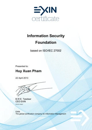 This document presents information security standards based on ISO/IEC 27002 standards to Huy Xuan Pham. It was presented on April 22, 2013 by B.W.E. Taselaar, the CEO of EXIN, an information management certification company. The document number is 4724103.1203827.