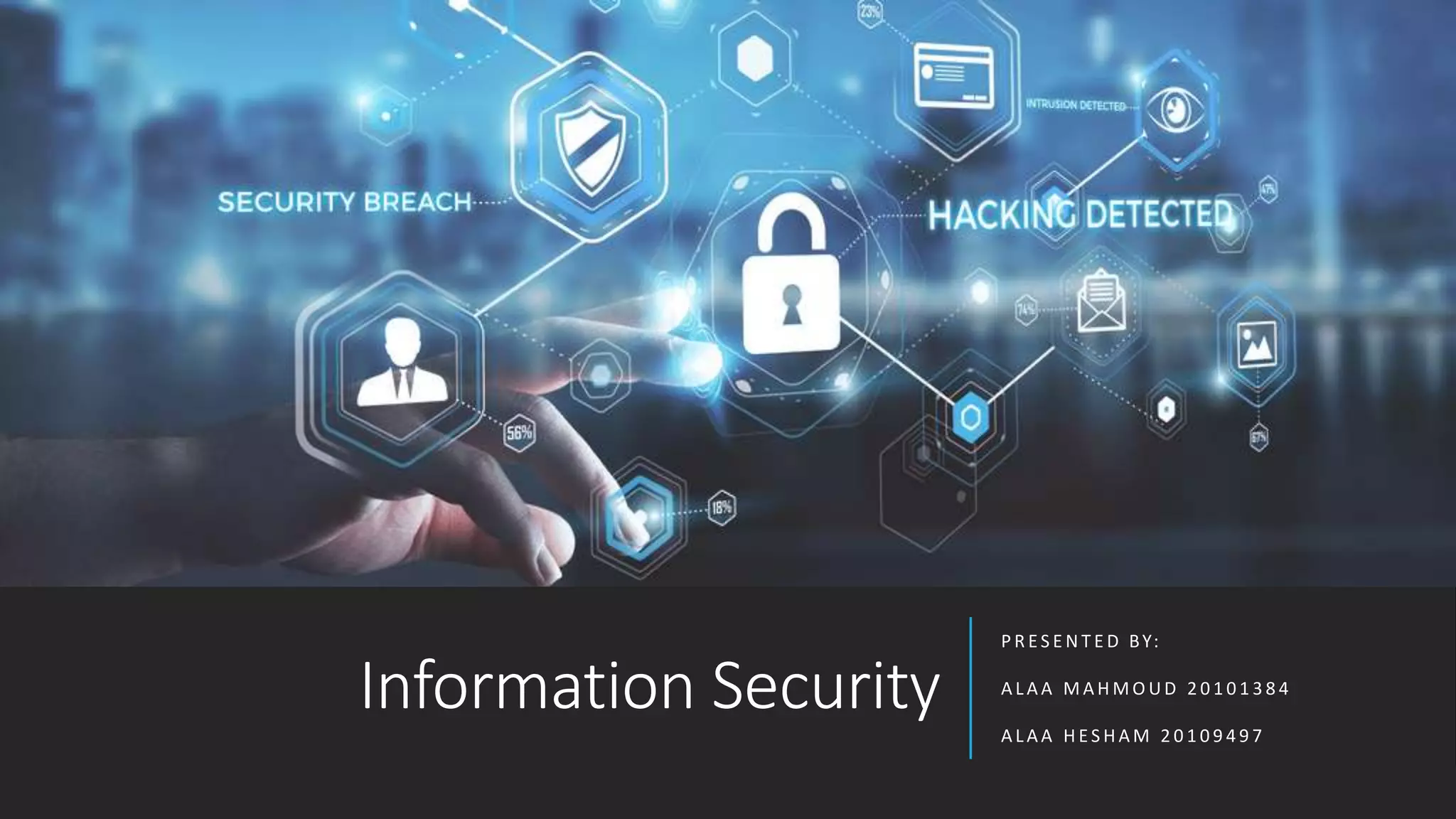 The document discusses information security and provides an agenda covering topics such as defining information security, principles of information security, examples of sensitive data, importance of information security, famous security threats and attacks, and how to protect systems. Information security refers to processes and methods used to protect sensitive information from unauthorized access or disruption, and the principles of information security are confidentiality, integrity, and availability. Examples of sensitive data include personal information like health records, financial information, and company or customer data.