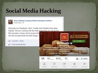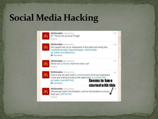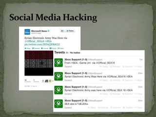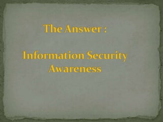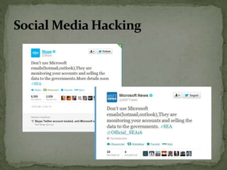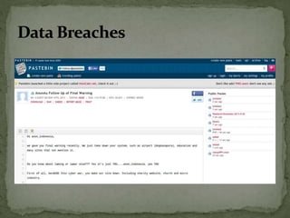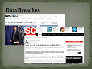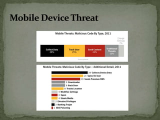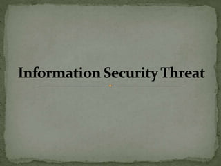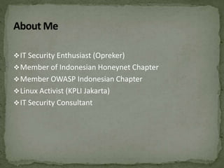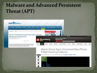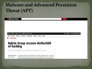 The document discusses the importance of information security amidst the rapid development of information and communication technology. It notes that security experts must always adapt to emerging threats like data breaches, social media hacking, mobile device threats, and advanced malware. Specific threats include the disclosure of sensitive personal and financial information online and through mobile apps. The rise of advanced persistent threats sponsored by governments to achieve political, economic, military and technical objectives is also examined. The document stresses the importance of organizations and individuals implementing proper security measures, policies and awareness programs.
