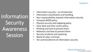 The document outlines key aspects of information security awareness, including responsibilities, policies, and strategies to mitigate risks such as phishing and malware. It emphasizes information classification, incident reporting, and the importance of compliance with security standards. Additionally, the document highlights the evolving nature of cybersecurity threats and provides a framework for organizational policies and practices.