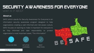 The 'Security Awareness for Everyone' (SAFE) program is designed to foster a culture of information security within organizations by educating employees on best practices to protect sensitive information. It offers a comprehensive learning approach, integrating various channels and interactive methods to ensure effective training on topics like password security and office safety. The program also includes a Learning Management System (LMS) that provides customizable and reportable training solutions to enhance user engagement.