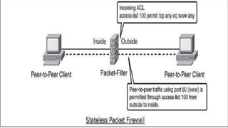 Firewalls are network security devices that control incoming and outgoing network traffic based on a set of security rules. There are three main types of firewalls: packet filtering firewalls, which filter network traffic at the packet level; application-level firewalls, which filter traffic at the application layer; and circuit-level firewalls, which monitor traffic connections and sessions. Firewalls provide security benefits but also have limitations, such as not preventing unauthorized internal access or protecting against social engineering attacks.