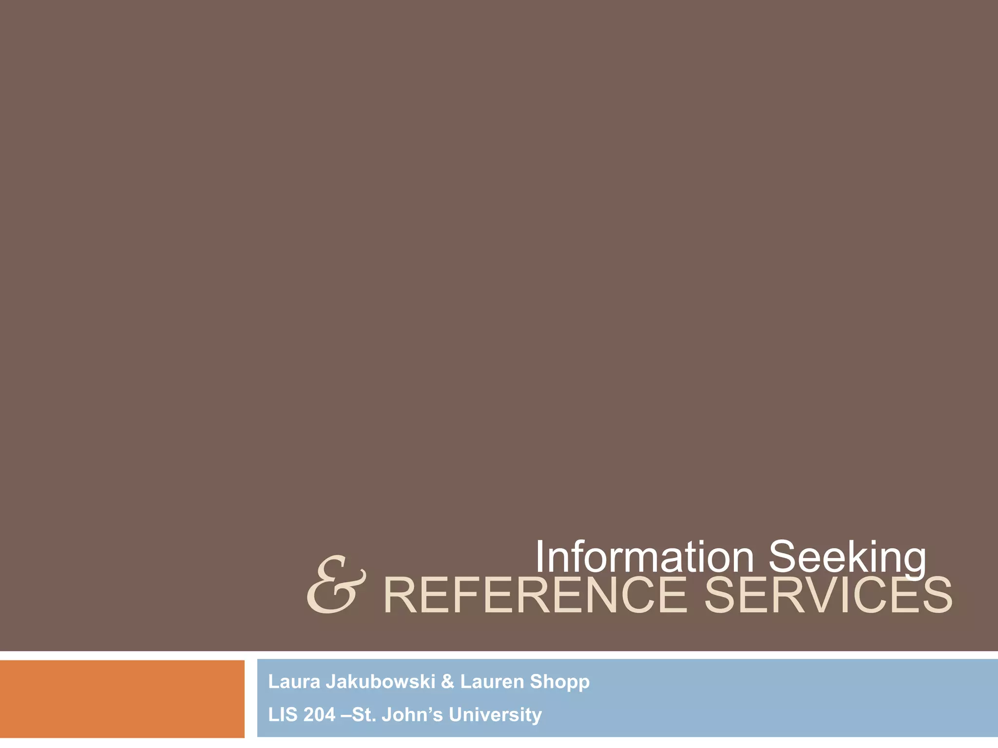 The document discusses information seeking behaviors and reference services. It explains that when an individual needs information, they experience an information need, seek information to address that need, and exhibit information behaviors in how they seek information. It also discusses how people tend to exert the least amount of effort when seeking information according to Zipf's Principle of Least Effort. The document then covers the objectives and tools of reference services, both historically and presently.