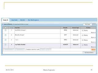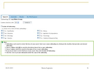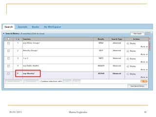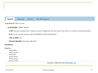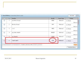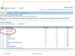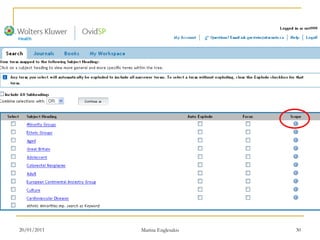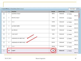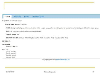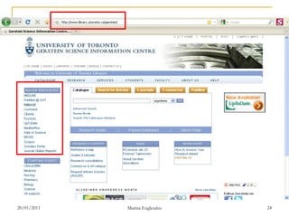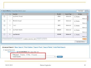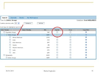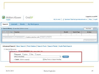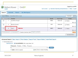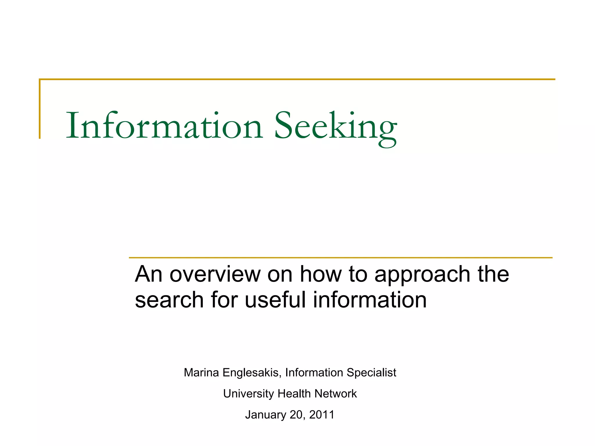 This document provides an overview of how to effectively search for information to answer a research question. It discusses developing a focused question using PICO elements, identifies appropriate biomedical databases like Medline and Embase, explains peer review of sources, and demonstrates using MeSH terms and Boolean operators to search Medline through Ovid. It also discusses evaluating websites, citation management software, and when to consult a librarian for help.