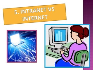 An intranet is a private computer network within an organization that uses internet protocols but is not accessible from outside the organization. It allows employees to easily share resources and communicate. In contrast, the internet is a worldwide network of networks that allows public information sharing on a global scale, with content accessible to all connected users. The key differences are that an intranet has restricted access controlled by authentication, while the internet is more open and globally accessible.
