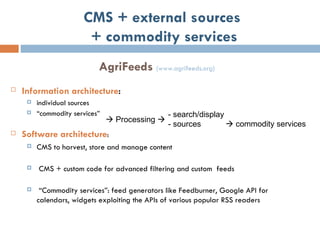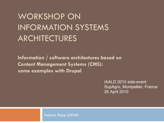 The document discusses a workshop on information and software architectures focused on content management systems (CMS), particularly using Drupal. It outlines the architecture for managing content, including the integration of external sources and commodity services, as well as the advantages and challenges of using CMS for information management. Key points include the dependence on the quality and availability of sources, the benefits of community support, and the potential to reduce the amount of custom code needed over time.