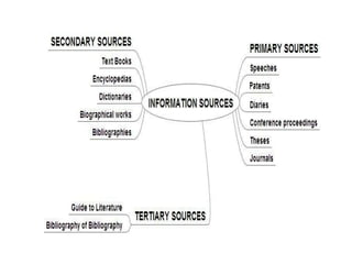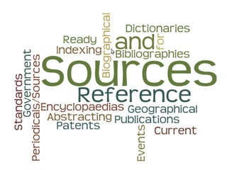 The document discusses various types of reference sources available in a library including encyclopedias, dictionaries, atlases, maps, and more. It provides examples of reference questions a library can help answer and describes the different reference sources that would be useful for topics like meanings of words, developments in an industry, book series information, Olympics details, and biographies. Sources mentioned include encyclopedias, dictionaries, atlases, telephone directories, newspapers, journals, and more.