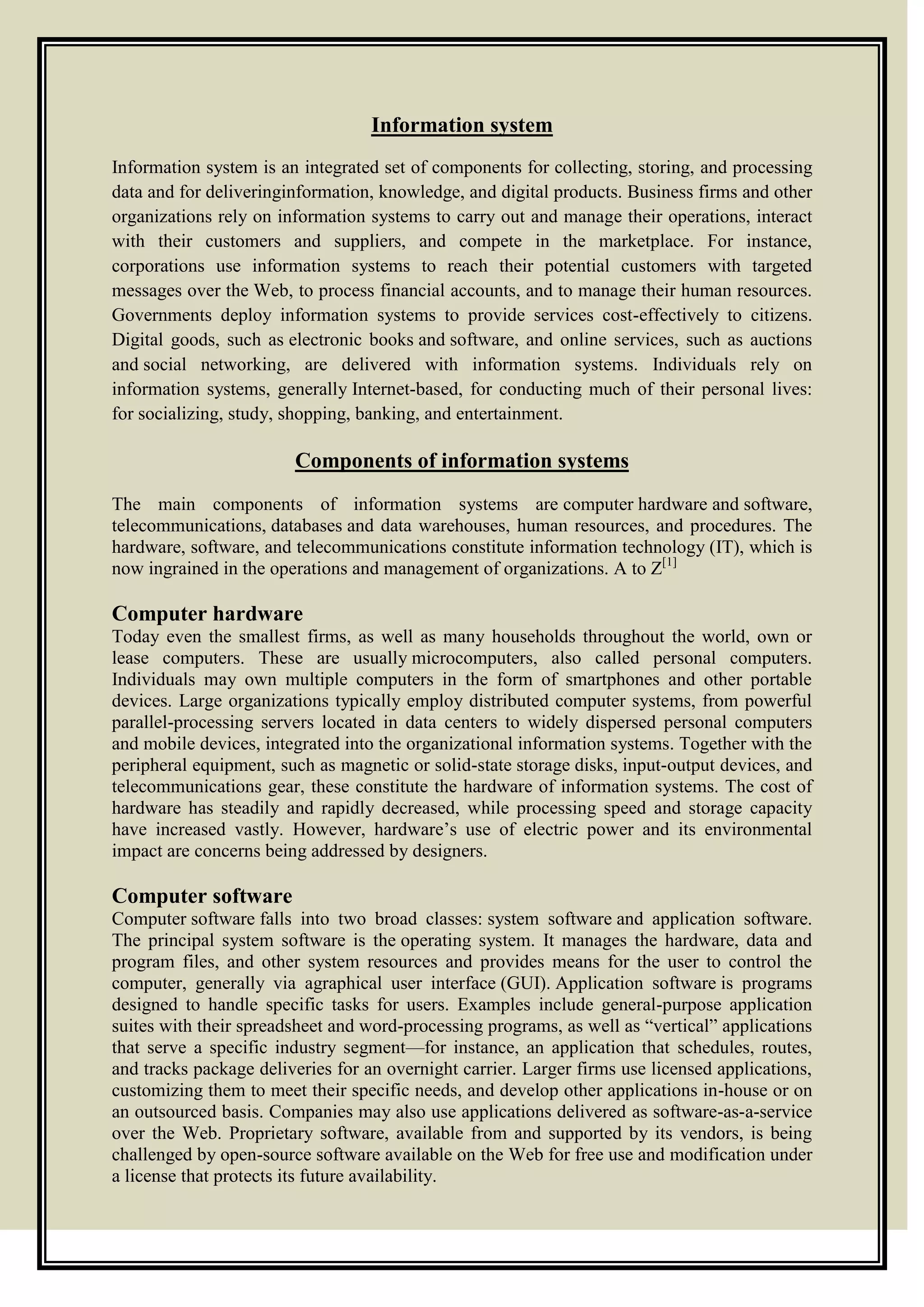 Information systems are integral to modern organizations, supporting operations, knowledge work, and management. An information system consists of hardware, software, databases, telecommunications, procedures, and human resources. It collects, stores, and processes data and delivers information to users. Information systems allow organizations to manage their operations more efficiently and compete effectively. They also support individuals in conducting personal activities. However, ensuring security and controlling access to sensitive information is important.