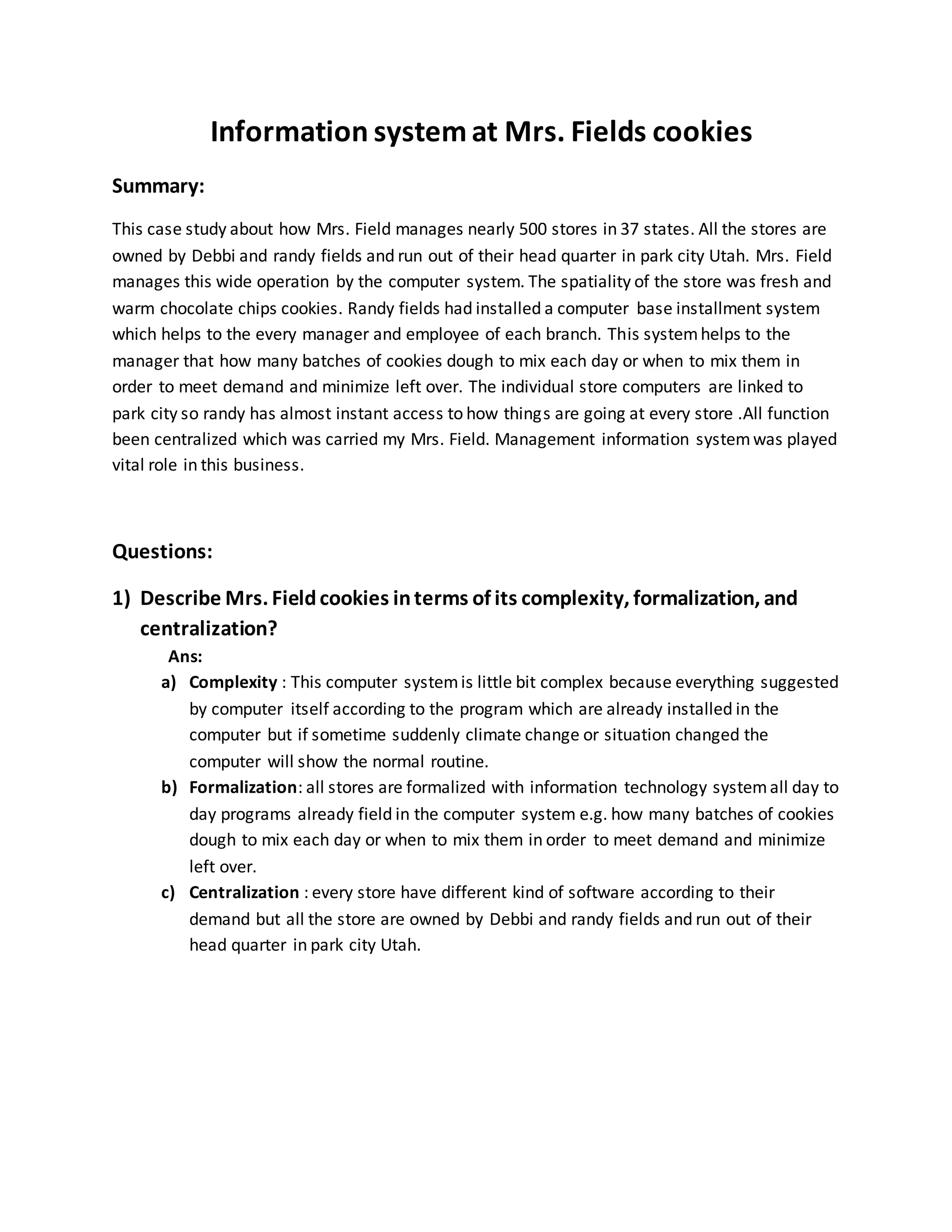 This case study describes how Mrs. Fields manages its nearly 500 cookie stores across 37 states through a centralized computer system. The system allows Randy Fields, who runs the company headquarters in Park City, Utah, to have almost instant access to how each store is operating. The individual store computers provide recommendations on tasks like how much cookie dough to mix each day to meet demand while minimizing leftovers. This management information system plays a vital role in coordinating the large operation and ensuring consistent fresh cookies across all locations.